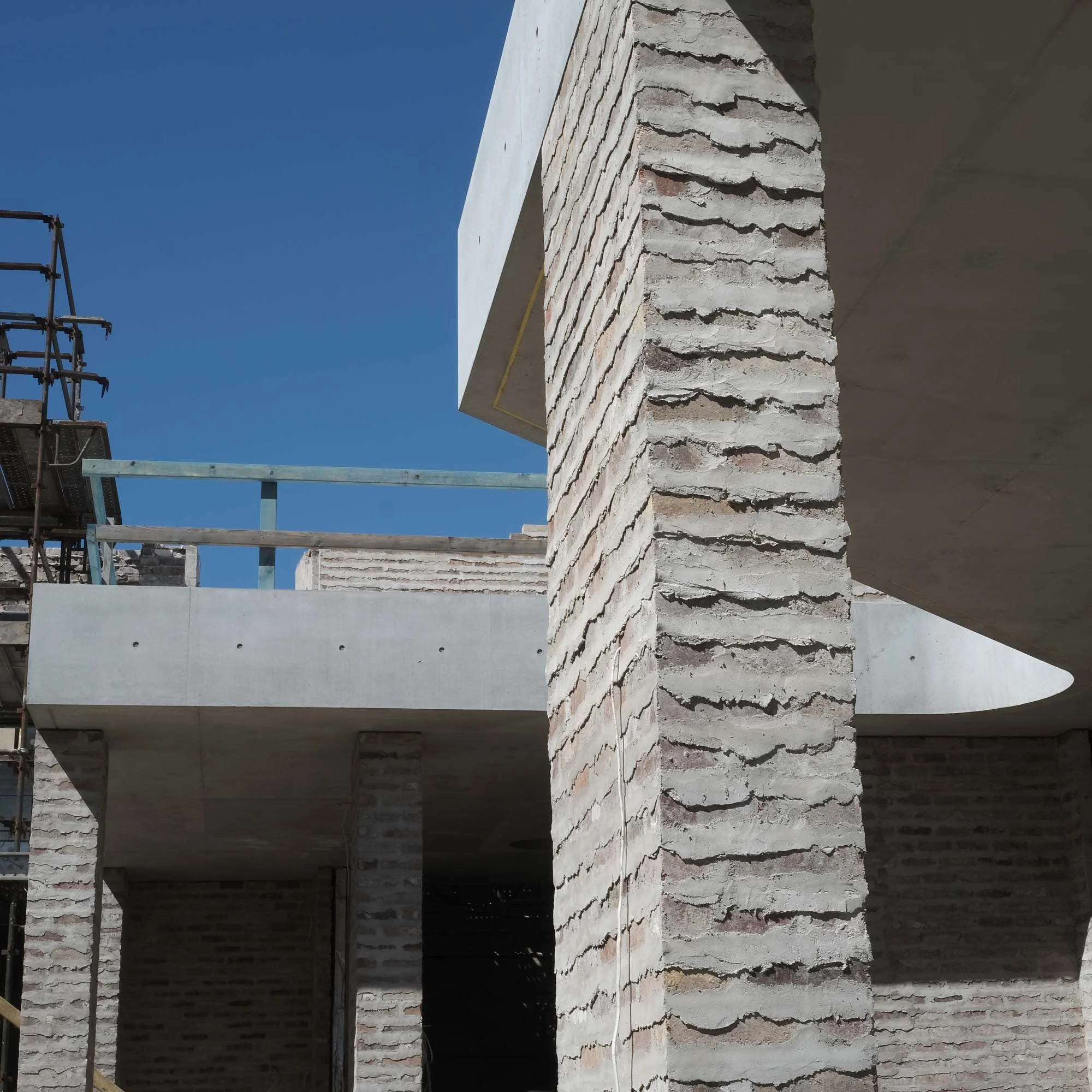 The brickwork is going up at the Kings Langley Cricket Club and amenities in Blacktown. The inside of the brick bakes at a different temperature and so the colour retains the red in the clay. By bolster-cutting the bricks and turning them rough-face out we continue the patterning of the hit &miss brickwork adjacent but at the same time it gives the wall a richness of colour and texture.